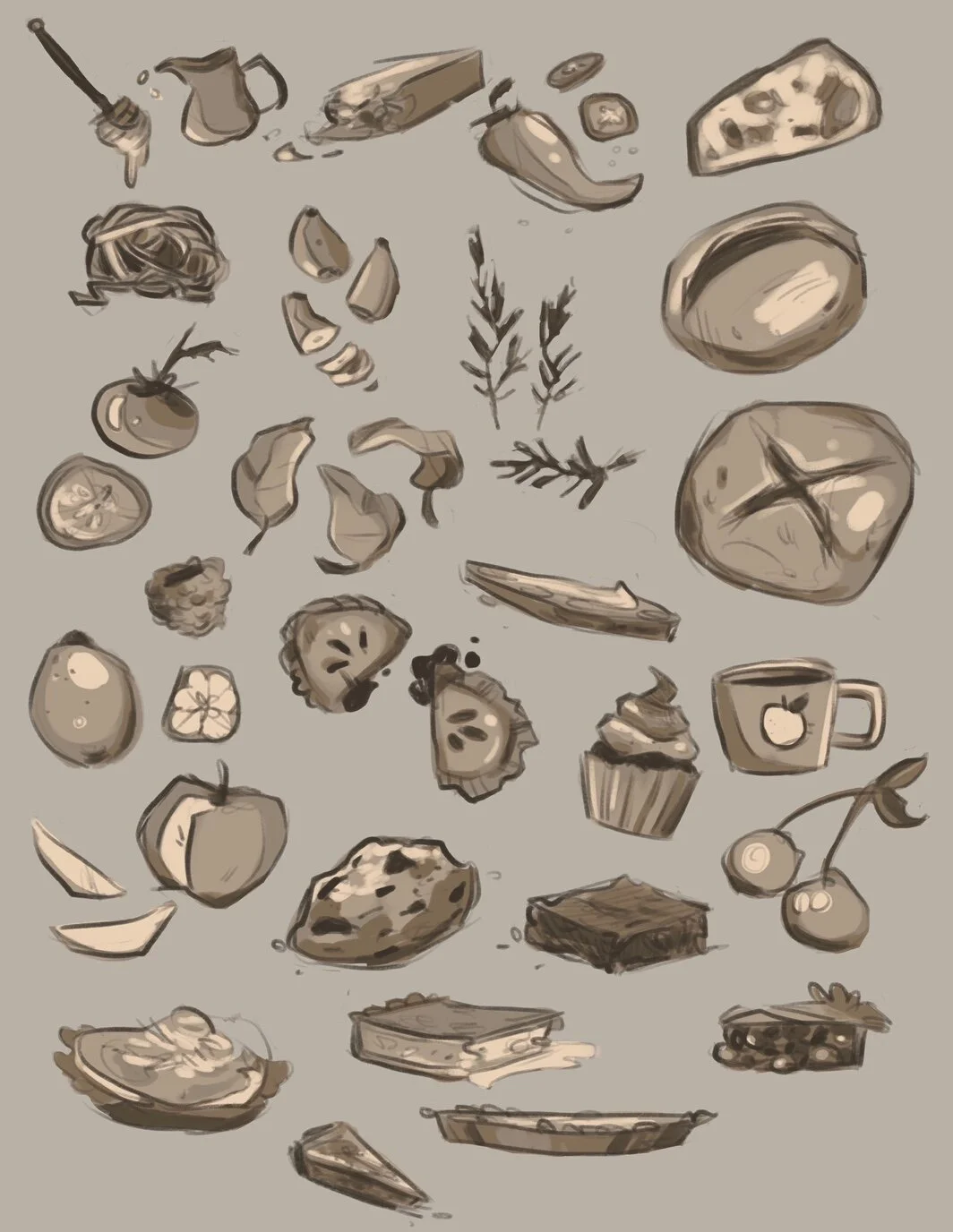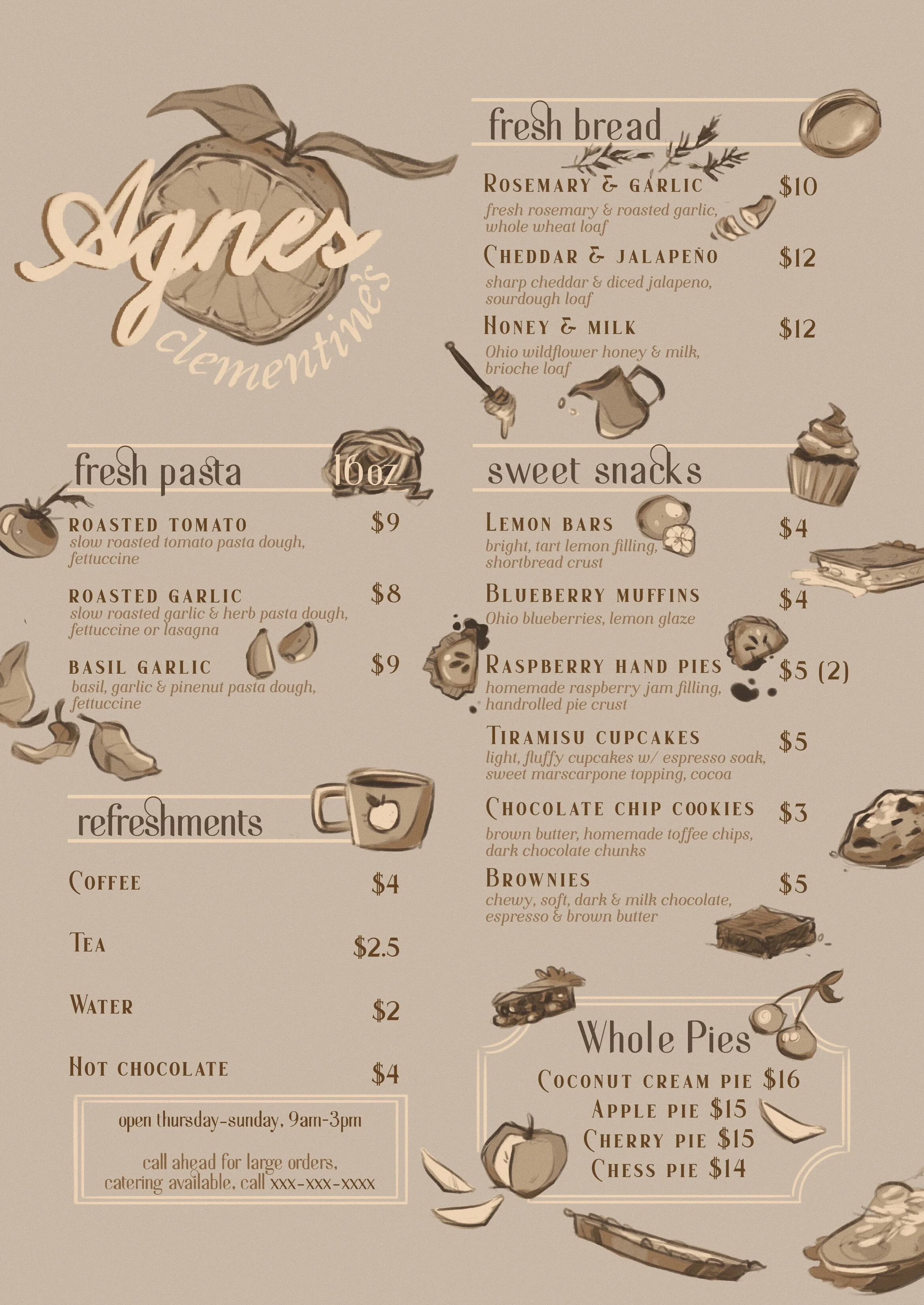 A small pop-up business that operates through the weekend, offering a range of menu items from freshly made pasta & bread, to brownies, pies & coffee. Intention is to use illustrative design to create a vintage inspired, clean, one page menu full of illustration assets.